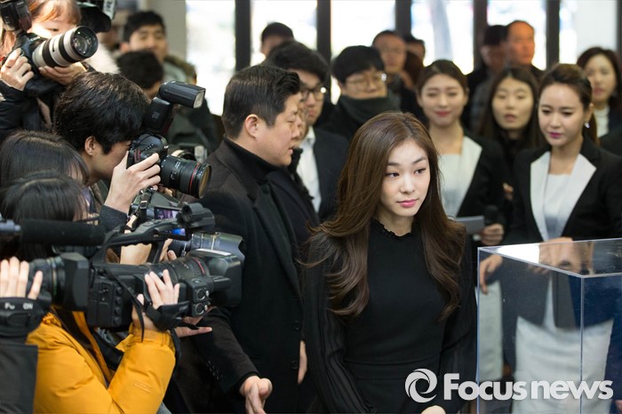 (서울=포커스뉴스) 전 피겨국가대표 김연아가 11일 오전 서울 종로구 종각 T월드 카페에서 삼성 갤럭시 S7 론칭행사에 참석하고 있다.