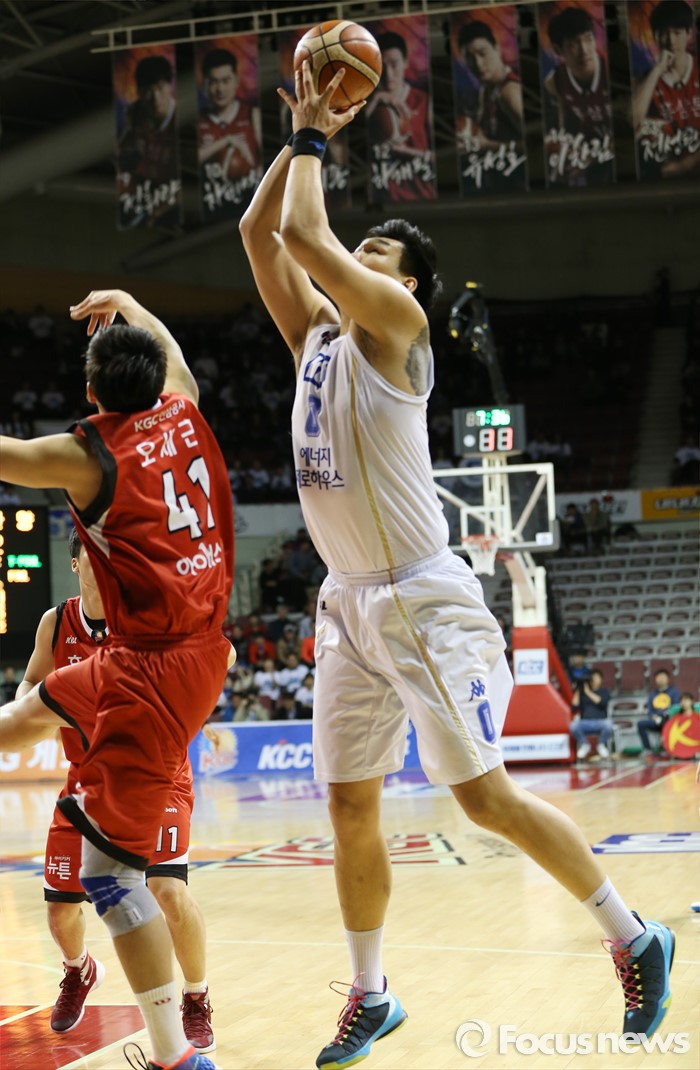 (안양=포커스뉴스) 11일 안양실내체육관에서 열린 2015-2016 프로농구 KGC-KCC 4강플레이오프 3차전에서 KCC 하승진이 KGC 오세근보다 월등한 높이로 리바운드볼을 잡고 있다.