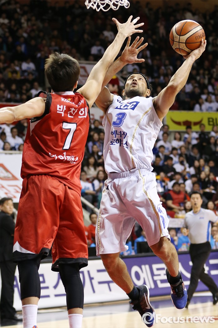 (안양=포커스뉴스) 11일 안양실내체육관에서 열린 2015-2016 프로농구 KGC-KCC 4강플레이오프 3차전에서 KCC 전태풍이 KGC 박찬희의 블록을 제치며 점프슛을 쏘고 있다.