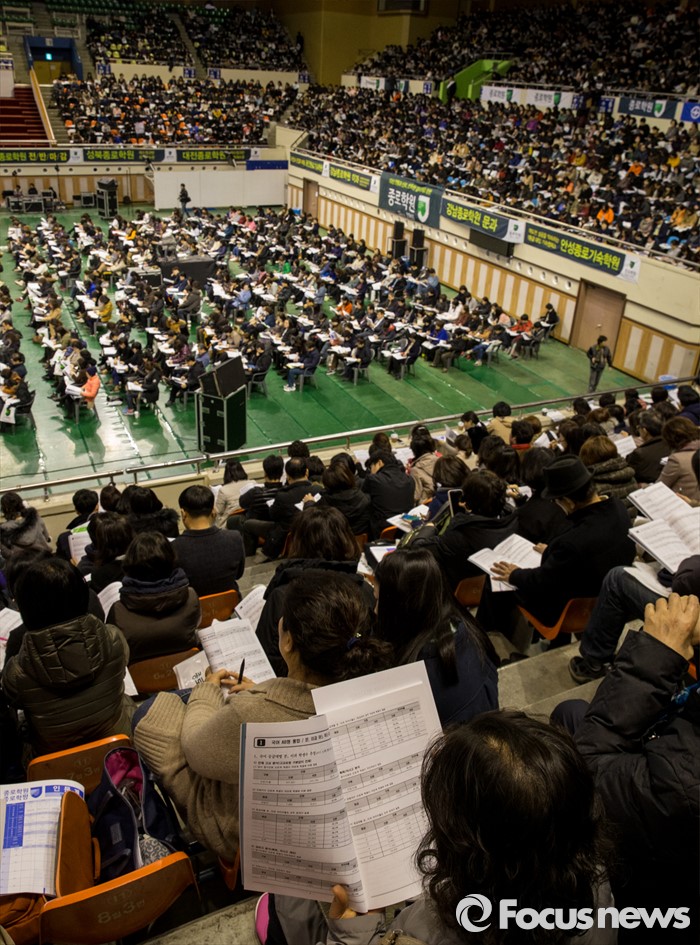 (서울=포커스뉴스) 12일 오후 서울 성동구 한양대학교 올림픽체육관에서 열린 '2017학년도 대학입시설명회'에 참석한 학부형, 수험생 및 관계자들이 주요 대학 배치참고표를 보고 있다.