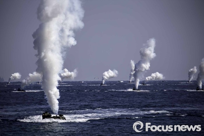 (포항=포커스뉴스) 12일 오후 경북 포항시 일대 해안에서 한미해병대의 연합상륙작전이 실시되었다. 해안가로 돌진하고 있는 상륙돌격장차들에서 일제히 연막을 전개하고 있다.