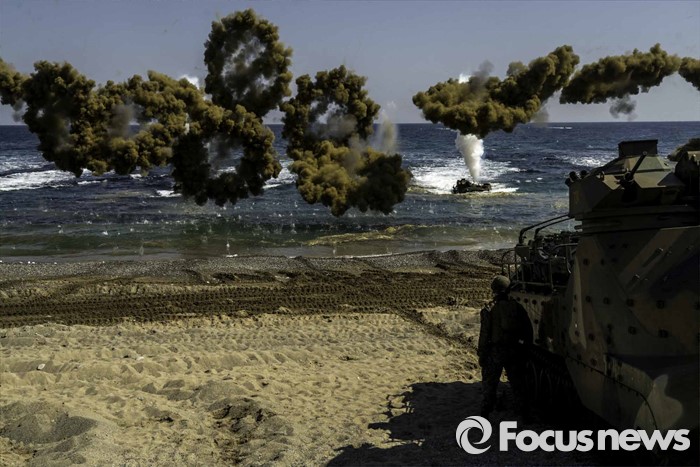 (포항=포커스뉴스) 12일 오후 경북 포항시 일대 해안에서 한미해병대의 연합상륙작전이 실시되었다. 해안가로 돌진하고 있는 상륙돌격장차들에서 일제히 연막을 전개하고 있다.