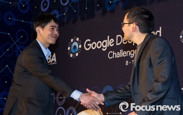 (서울=포커스뉴스) 12일 오후 서울 종로구 포시즌스호텔에서 열린 구글 딥마인드 챌린지 매치 제3국 기자회견에 참석한 이세돌) 9단(왼쪽), 데미스 하사비스 구글 딥마인드 대표가 악수하고 있다.