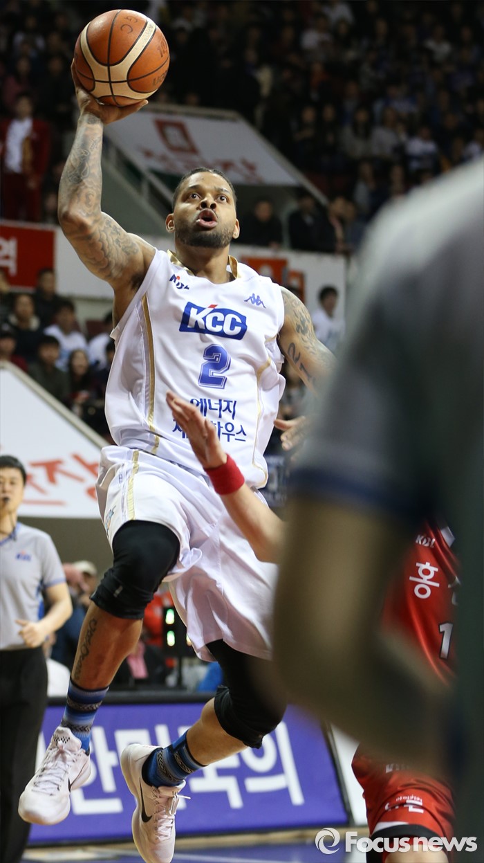 (안양=포커스뉴스) 13일 안양실내체육관에서 열린 2015-2016 프로농구 KGC-KCC 4강플레이오프 4차전에서 KCC 안드레 에밋이 KGC 양희종을 제치며 레이업슛을 쏘고 있다.