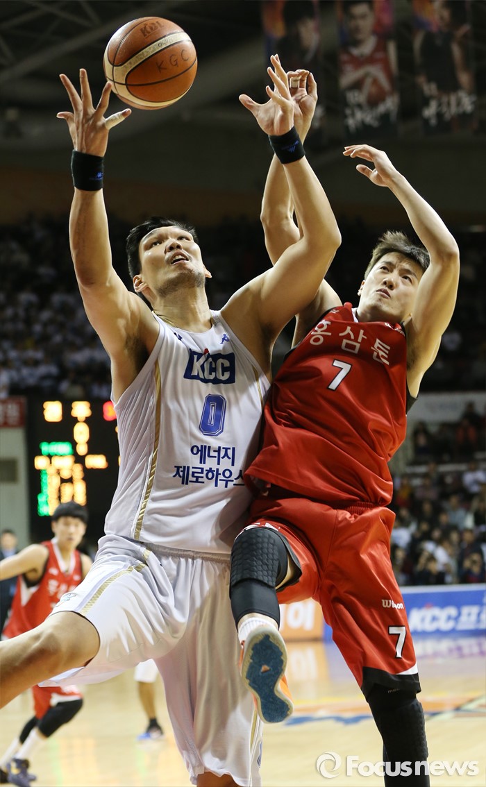 (안양=포커스뉴스) 13일 안양실내체육관에서 열린 2015-2016 프로농구 KGC-KCC 4강플레이오프 4차전에서 KCC 하승진이 KGC 박찬희를 제치며 리바운드볼을 잡고 있다.