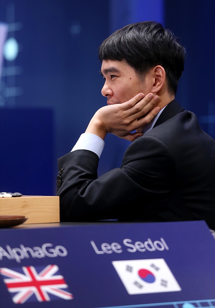 (서울=포커스뉴스) 이세돌 9단이 13일 오후 서울 종로구 포시즌스호텔에서 열린 구글 딥마인드 챌린지 매치 제4국에서 인공지능 바둑프로그램 알파고에게 첫 승리를 거두고 복기를 하며 웃고 있다. <사진제공=구글>