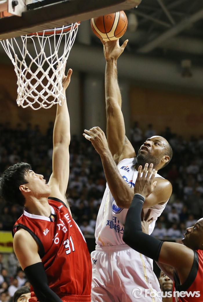 (안양=포커스뉴스) 13일 안양실내체육관에서 열린 2015-2016 프로농구 KGC-KCC 4강플레이오프 4차전에서 KCC 허버트 힐이 KGC 김민욱의 마크 위로 원핸드슛을 쏘고 있다.