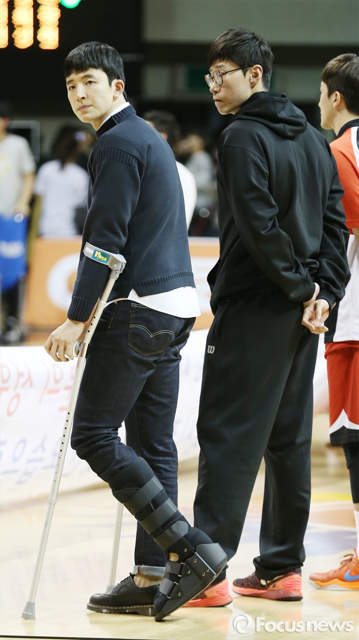 (안양=포커스뉴스) 13일 안양실내체육관에서 열린 2015-2016 프로농구 KGC-KCC 4강플레이오프 4차전을 마치고 부상으로 전력에서 이탈한 KGC 강병현(왼쪽)과 오세근이 관중에게 인사하고 있다.