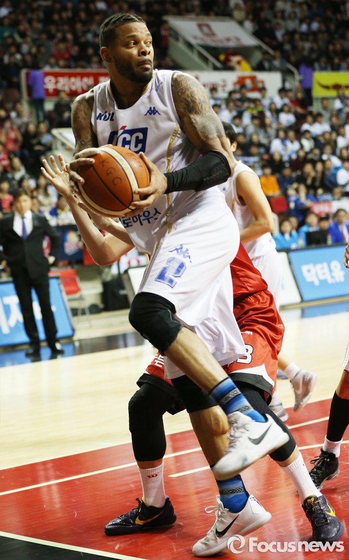 (안양=포커스뉴스) 13일 안양실내체육관에서 열린 2015-2016 프로농구 KGC-KCC 4강플레이오프 4차전에서 KCC 안드레 에밋이 엔드라인에 몰리자 패스를 시도하고 있다.