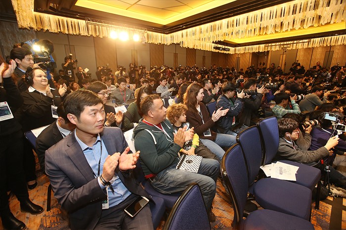 한편 세르게이 브린 구글 공동창업자도 경기 종료 직후 기자회견장을 깜짝 방문해 이 9단에게 축하의 말을 전했다. 브린 구글 공동창업자는 "방금 이세돌을 만나 축하한다는 말을 전했지만 다시 한 번 전하고 싶다"며 "흥미진진한 대국을 잘 치러 감사하다"고 말했다.(서울=포커스뉴스) 13일 오후 서울 종로구 포시즌스호텔에서 열린 구글 딥마인드 챌린지 매치에서 이세돌 9단이 인공지능 바둑프로그램 알파고를 누르고 첫 승리를 거두자 중계를 지켜보던 기자와 관객들이 박수를 치고 있다. <사진제공=구글> 2016.03.13 포커스포토