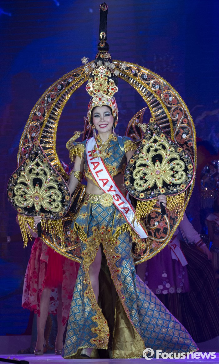 (동관/중국=포커스뉴스) 12일 오후 중국 광동성 동관에서 열린 제27회 미시즈월드 미인대회에서 말레이시아 참가자가 의상을 입고 포즈를 취하고 있다.