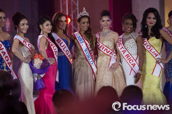 (동관/중국=포커스뉴스)중국 광동성 동관에서 12일 열린 제27회 미시즈월드 미인대회에서 우승자인 남아공 캔디스 드보라 아브람스(가운데)와 참가자들이 포즈를 취하고 있다. 우승은 남아프리카 공화국의 캔디스 드보라 아브람스, 2위는 폴란드의 클라우디아 마트라크 두덱, 3위는 한국의 최은혜가 차지했다.