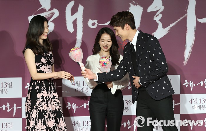 (서울=포커스뉴스) 14일 오전 서울 광진구 롯데시네마 건대입구점에서 열린 영화 '해어화' 제작보고회에 참석한 배우 유연석(오른쪽)이 포토타임을 갖던중 동료 배우 한효주(왼쪽부터), 천우희에게 사탕을 선물하고 있다.