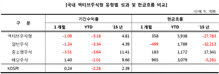 한국펀드평가의 펀드리서치 시스템 ‘펀드스퀘어(FundSquare)’에 따르면 배당주식형 펀드는 지난 2월 한 달 동안 국내 액티브 주식 유형 내에서 유일하게 플러스 성과를 기록했다. 또 연초이후 3079억원의 현금이 유입됐다. 다소 이례적이다.