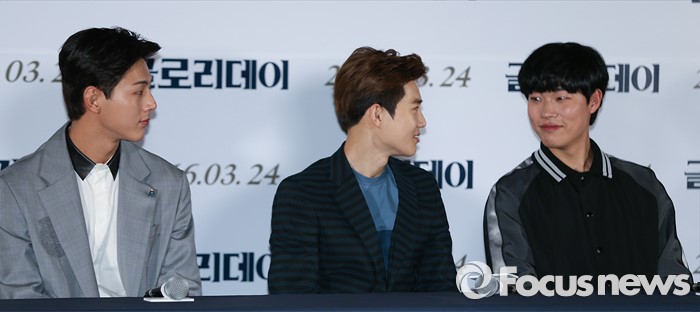 (서울=포커스뉴스) 14일 오후 서울 성동구 왕십리 CGV에서 열린 영화 '글로리데이' 언론시사회에 참석한 배우 지수(왼쪽부터), 김준면, 류준열이 미소를 짓고 있다.