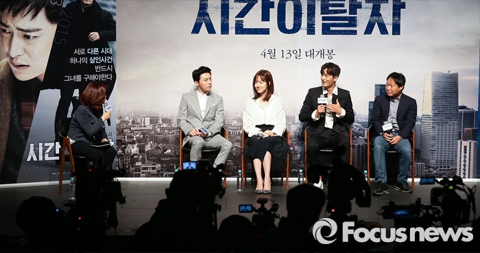 (서울=포커스뉴스) 15일 오전 서울 강남구 압구정 CGV에서 열린 영화 '시간이탈자' 제작보고회에 참석한 배우 이진욱(오른쪽 두번째)가 질문에 답하고 있다. 왼쪽부터 진행자 박경림, 배우 조정석, 임수정, 이진욱, 영화감독 곽재용.