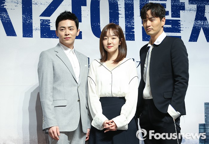 (서울=포커스뉴스) 15일 오전 서울 강남구 압구정 CGV에서 열린 영화 '시간이탈자' 제작보고회에 참석한 배우 조정석(왼쪽부터), 임수정, 이진욱이 포토타임을 갖고 있다.