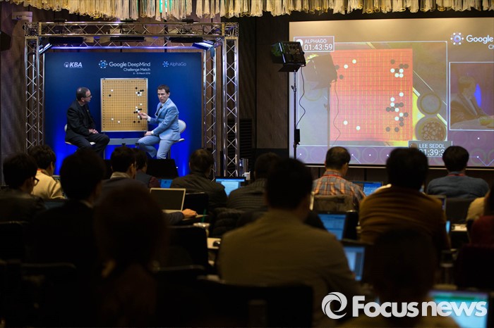 이후 이 9단은 좌상귀에서 백 석 점을 입구자로 어깨를 짚으며 다시 싸움에 나섰다. 무난하게 후하귀에 집을 마련하는 한편, 오히려 좌상귀의 백에 대한 압박도 놓치지 않겠다는 의미로 보인다. 한편 이날 이 9단은 4국에서의 막판 초읽기를 염두해 둔 듯 알파고 못지 않은 빠른 착수를 보이고 있다.(서울=포커스뉴스) 외국 해설자들이 15일 오후 서울 종로구 포시즌스호텔에서 구글 딥마인드 챌린지 매치, 인공지능 바둑프로그램 알파고와의 다섯번째 대국을 해설하고 있다. 2016.03.15 성동훈 기자