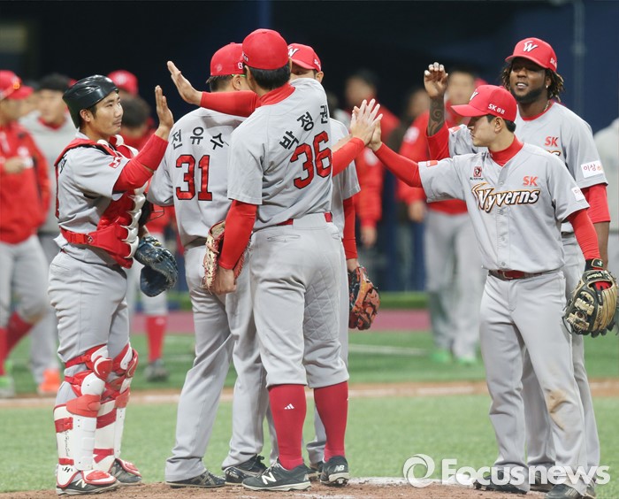 (서울=포커스뉴스) 15일 서울 고척스카이돔에서 열린 2016 프로야구 시범경기 SK-넥센전에서 넥센을 6-4로 물리친 SK 선수들이 마운드에 모여 하이파이브를 하고 있다.