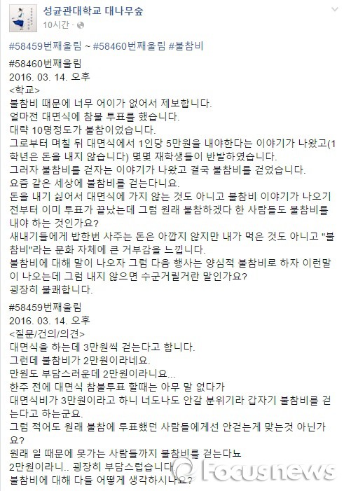 이러한 불참비 논란에 대해 김찬호(23) 성대 수학교육과 비상대책위원장은 "과거에 관례적으로 불참비를 받았지만 지난해부터 자율적으로 불참비를 받고 있다"며 "이후 학생총회를 통해서 학생 의견을 반영하겠다"며 개선의 뜻을 전했다.14일 오후 성균관대학교 익명 페이스북 페이지 '성균관대학교 대나무숲'에 선후배 대면식 불참비에 대해 비판하는 게시글이 올라왔다. <사진출처=성균관대학교 익명 페이스북 페이지 '성균관대학교 대나무숲' 캡처>