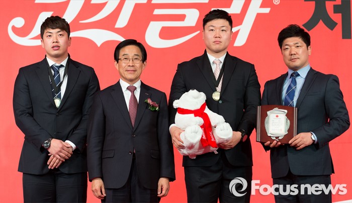 (서울=포커스뉴스) 16일 오전 서울 중구 더플라자호텔 그랜드볼룸에서 제21회 코카콜라 체육대상 시상식에 참석한 봅슬레이팀 서영우(왼쪽)와 원윤종(오른쪽 두번째), 이용 감독이 고 맬컴 로이드 코치를 대신해 우수지도자상을 대리수상하고 있다.
