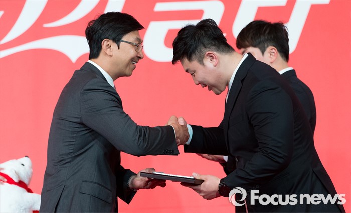 (서울=포커스뉴스) 16일 오전 서울 중구 더플라자호텔 그랜드볼룸에서 제21회 코카콜라 체육대상 시상식에 참석한 봅슬레이 대표 원윤종과 서영우가 최우수선수상을 수상하고 있다.