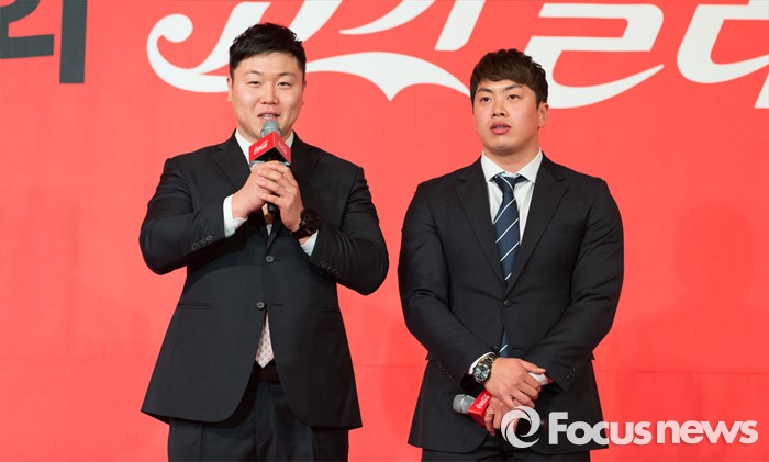 (서울=포커스뉴스) 16일 오전 서울 중구 더플라자호텔 그랜드볼룸에서 제21회 코카콜라 체육대상 시상식에 참석한 봅슬레이 대표 원윤종(왼쪽)과 서영우가 최우수선수상 수상 후 소감을 전하고 있다.