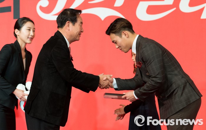 (서울=포커스뉴스) 16일 오전 서울 중구 더플라자호텔 그랜드볼룸에서 제21회 코카콜라 체육대상 시상식에 참석한 스켈레톤 대표 윤성빈이 신인상을 수상하고 있다.