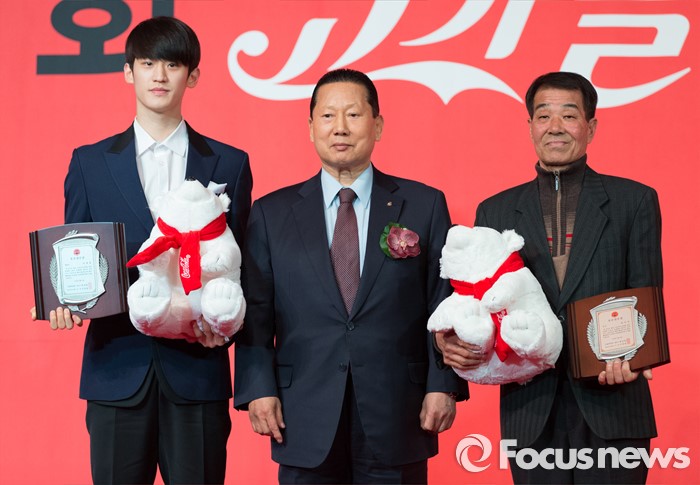 (서울=포커스뉴스) 16일 오전 서울 중구 더플라자호텔 그랜드볼룸에서 제21회 코카콜라 체육대상 시상식에 참석한 이대훈(왼쪽)과 최보녕(여자양궁대표 최미선 아버지 대리수상) 씨가 우수선수상 수상 후 기념촬영을 하고 있다. 가운데는 김정행 대한체육회 회장.
