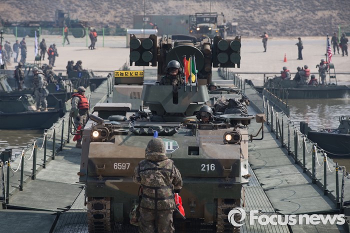 (이천=포커스뉴스) 16일 오전 경기도 이천시 7공병여단 도하훈련장에서 열린 한국군 제7공병여단 도하대대와 미군 제2전투항공여단 공병대대의 '한·미 연합 소부대 도하훈련'에서 전차와 장갑차들이 부교를 도하하고 있다.