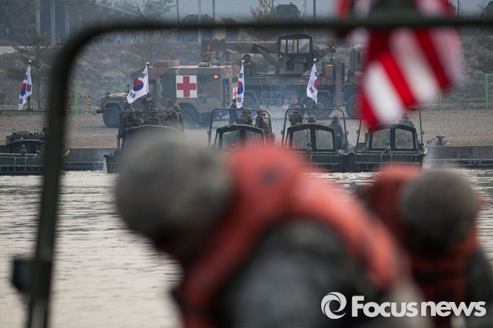 (이천=포커스뉴스) 16일 오전 경기도 이천시 7공병여단 도하훈련장에서 한국군 제7공병여단 도하대대와 미군 제2전투항공여단 공병대대 장병들이 한미 연합 도하훈련 준비를 하고 있다.