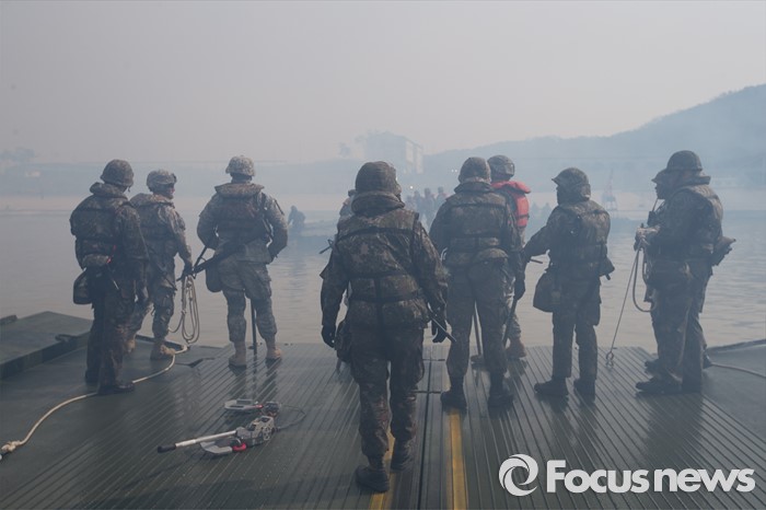 (이천=포커스뉴스) 16일 오전 경기도 이천시 7공병여단 도하훈련장에서 열린 '한·미 연합 소부대 도하훈련'에서 한국군 제7공병여단 도하대대와 미군 제2전투항공여단 공병대대 장병들이 부교를 설치하고 있다.