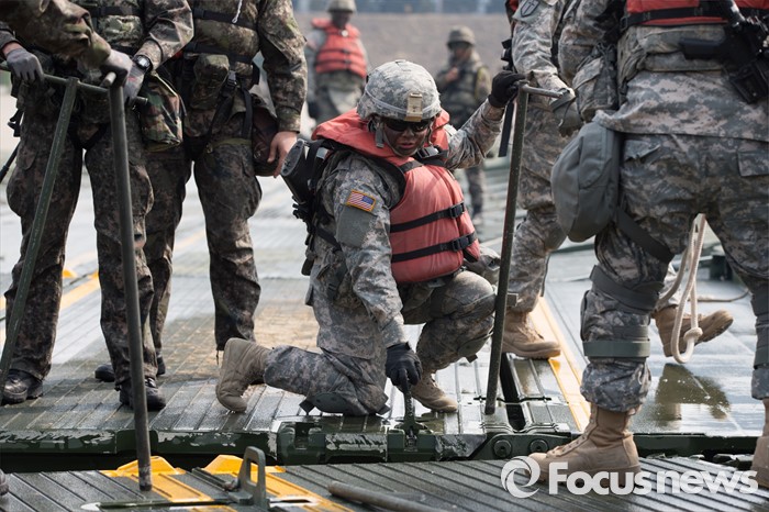 (이천=포커스뉴스) 16일 오전 경기도 이천시 7공병여단 도하훈련장에서 열린 '한·미 연합 소부대 도하훈련'에서 한국군 제7공병여단 도하대대와 미군 제2전투항공여단 공병대대 장병들이 부교를 설치하고 있다.