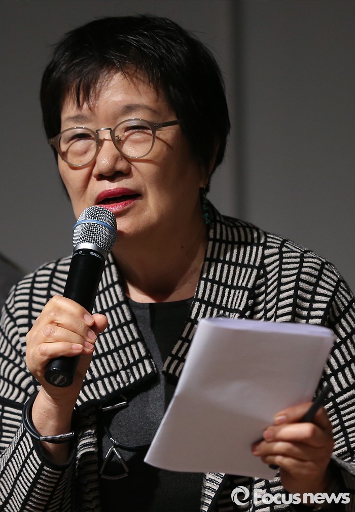 (서울=포커스뉴스) 16일 오후 서울 종로구 미마지아트센터 눈빛극장에서 열린 연극 '두 코리아의 통일' 프레스콜에 참석한 극단 프랑코포니 임혜경 대표가 질문에 답하고 있다.