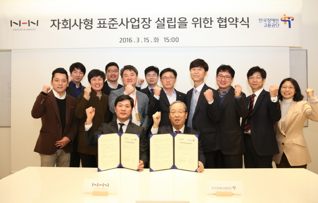 (서울=포커스뉴스) NHN엔터테인먼트(대표 정우진)가 한국장애인고용공단(이사장 박승규)과 함께 장애인 일자리 창출을 위한 '자회사형 장애인 표준사업장'을 설립한다고 16일 밝혔다. 이번 협약을 계기로 NHN엔터테인먼트는 오는 4월 중 자회사형 표준사업장을 설립해 중증장애인을 위한 안정된 일자리를 창출한다는 계획이다.
