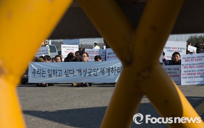 (파주=포커스뉴스) 16일 오후 경기도 파주시 통일대교에서 개성공단 입주기업, 영업기업, 협력기업 등 대표를 비롯한 임직원과 가족들이 공단재가동 및 실질보상을 촉구하며 '개성공단 평화대행진 집회'를 하고 있다.