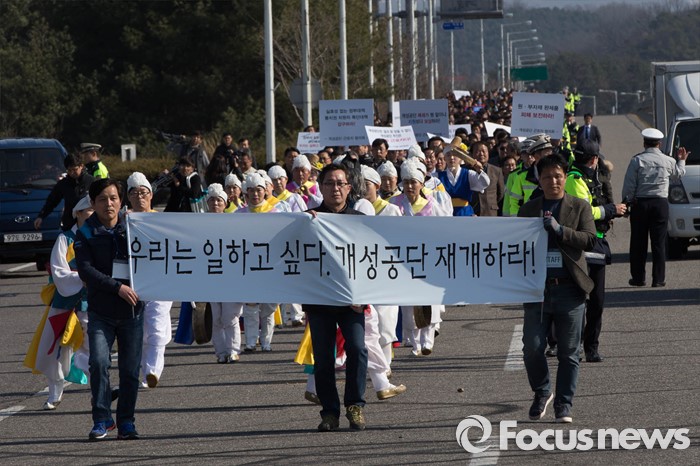 (파주=포커스뉴스) 16일 오후 경기도 파주시 통일대교에서 개성공단 입주기업, 영업기업, 협력기업 등 대표를 비롯한 임직원과 가족들이 공단재가동 및 실질보상을 촉구하며 '개성공단 평화대행진'을 하고 있다.