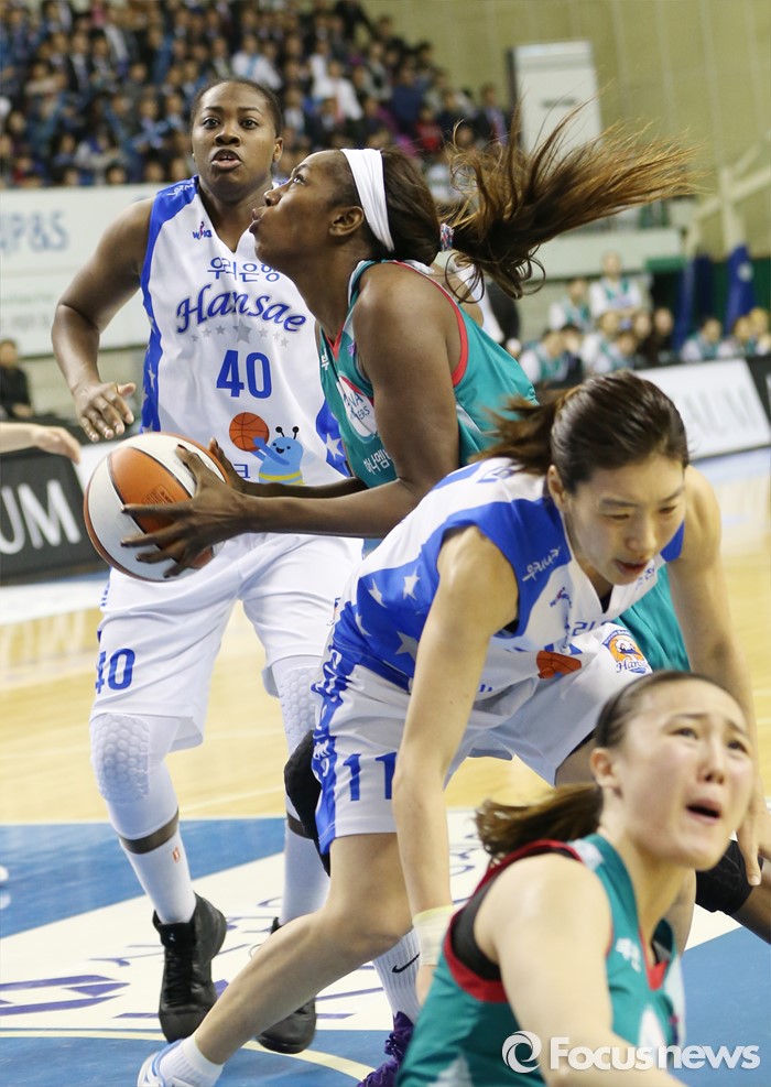(춘천=포커스뉴스) 춘천호반체육관에서 열린 2015~2016 여자프로농구 우리은행-KEB하나 챔피언결정전 1차전에서 골밑 혼전중 볼을 잡은 KEB하나 모스비가 슈팅을 노리고 있다.