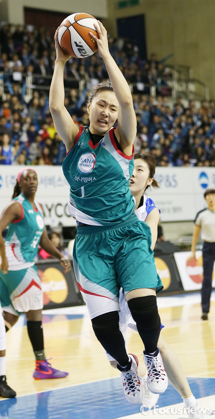 (춘천=포커스뉴스) 춘천호반체육관에서 열린 2015~2016 여자프로농구 우리은행-KEB하나 챔피언결정전 1차전에서 KEB하나 염윤아가 우리은행 박혜진에 앞서 리바운드볼을 잡고 있다.