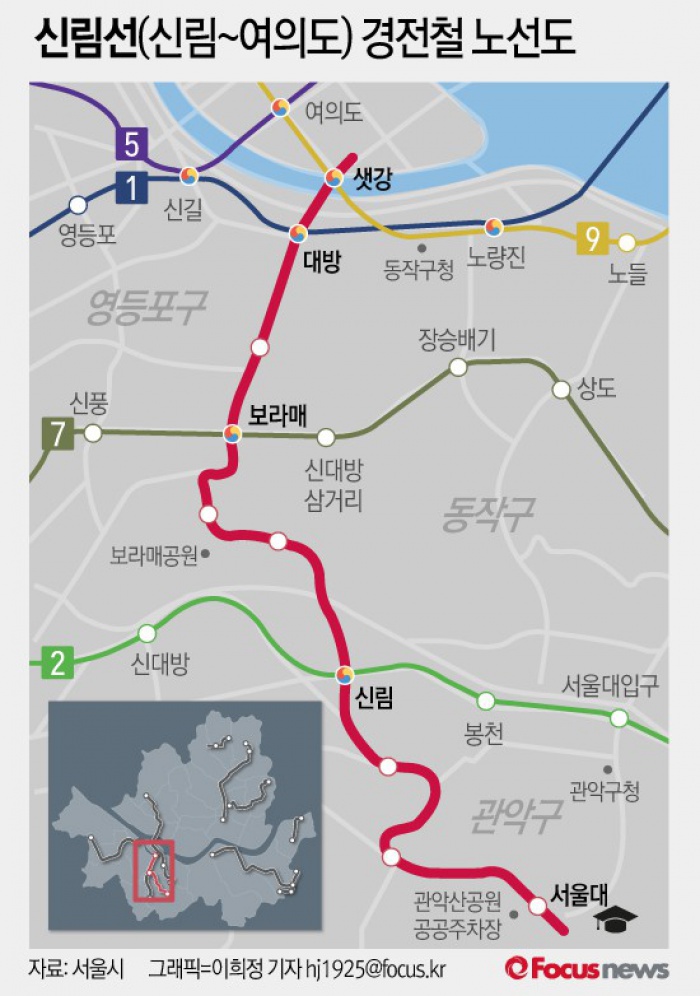 | △ [그래픽] 신림선(신림~여의도) 경전철 노선도 |