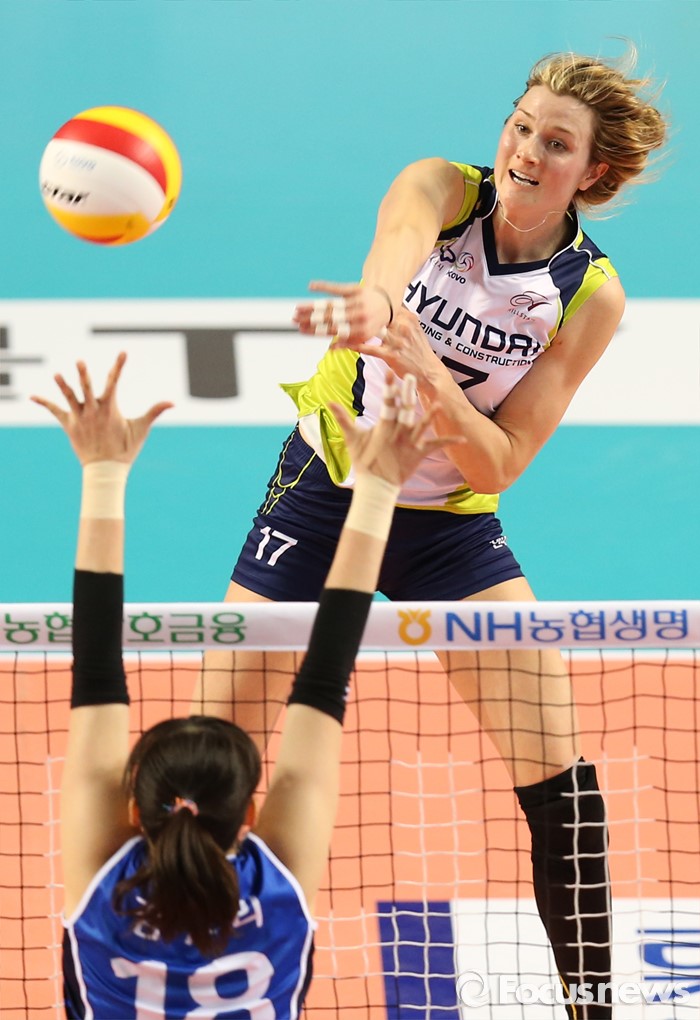 (화성=포커스뉴스) 17일 화성실내체육관에서 열린 2015-2016 V-리그 여자부 챔피언결정전 1차전 IBK기업은행-현대건설 경기에서 현대건설 에밀리가 IBK기업은행 김유리의 블로킹 위로 스파이크를 하고 있다.