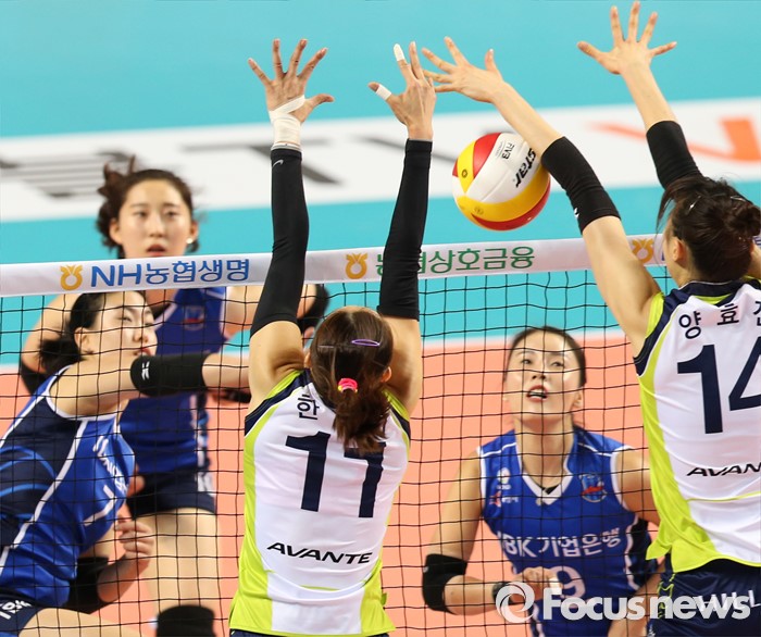 (화성=포커스뉴스) 17일 화성실내체육관에서 열린 2015-2016 V-리그 여자부 챔피언결정전 1차전 IBK기업은행-현대건설 경기에서 현대건설 양효진과 한유미가 IBK기업은행 최은지의 공격을 블로킹으로 넘기고 있다.
