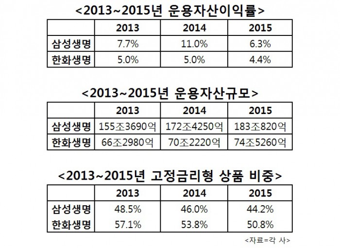 삼성생명의 운용자산규모가 한화생명의 2배 이상이라는 점을 감안할 때 삼성생명의 운용자산수익률 하락은 더욱 큰 영향을 미치는 실정이다. 삼성생명의 2015년말 운용자산규모는 183조820억원, 한화생명은 이의 40%수준인 74조5260억원이다.