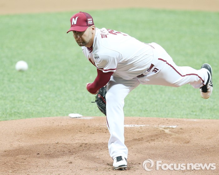 (서울=포커스뉴스) 18일 서울 고척스카이돔에서 열린 2016 프로야구 시범경기 두산-넥센 경기 1회초 넥센 선발 피어밴드가 힘차게 투구하고 있다.
