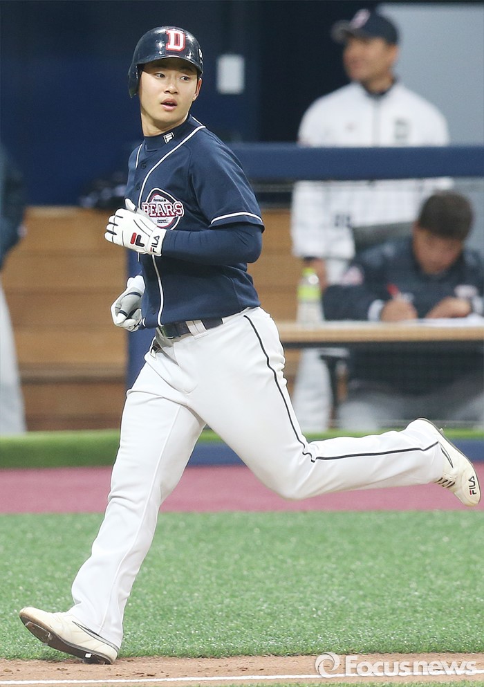 (서울=포커스뉴스) 18일 서울 고척스카이돔에서 열린 2016 프로야구 시범경기 두산-넥센 경기 7회 무사 2루에서 두산 서예일이 우월 2점 홈런을 치고 타구가 떨어진 지점을 바라보며 홈인하고 있다.