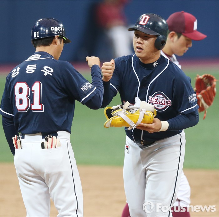 사직 롯데-NC전, 대전 한화-SK전, 광주 KIA-삼성전은 취소됐다. 시범경기는 추후 편성되지 않는다.(서울=포커스뉴스) 18일 서울 고척스카이돔에서 열린 2016 프로야구 시범경기 5회초 두산 선두타자 이우성이 좌익수 왼쪽에 떨어지는 2루타를 치고 강동우 코치와 주먹을 마주치고 있다. 2016.03.18 우정식 기자