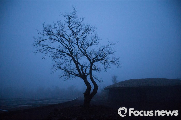 (제주=포커스뉴스) 안개 자욱한 18일 오후 제주시 남조로 돌문화공원에서 보는 팽나무(폭낭)와 초가집