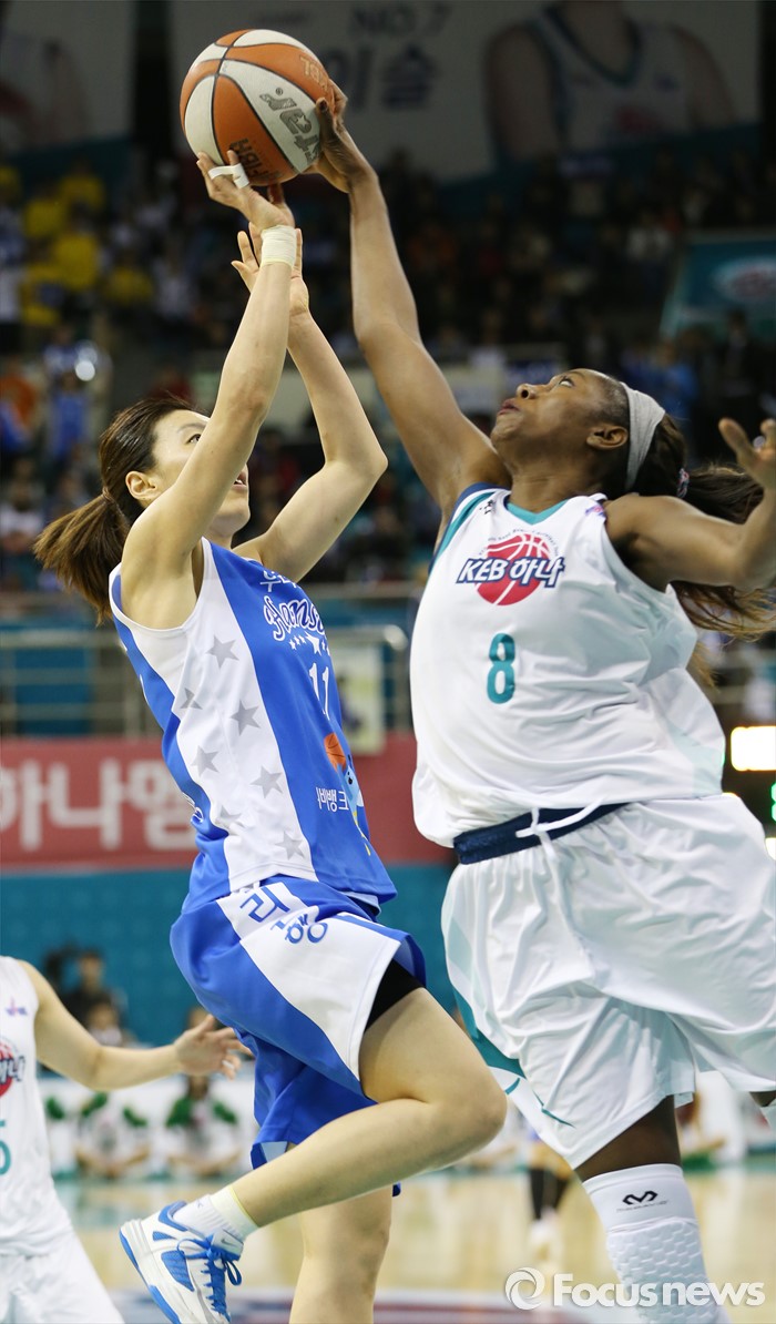 (부천=포커스뉴스) 20일 부천체육관에서 열린 2015-2016 여자프로농구 챔피언결전전 3차전 KEB하나은행-우리은행 경기에서 우리은행 임영희의 골밑슛을 KEB하나 모스비가 슛블록을 하고 있다.