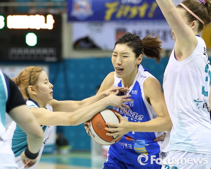 (부천=포커스뉴스) 20일 부천체육관에서 열린 2015-2016 여자프로농구 챔피언결전전 3차전 KEB하나은행-우리은행 경기에서 돌파하는 우리은행 임영희에게 KEB하나 김이슬이 볼을 뺏으려 달려들고 있다.