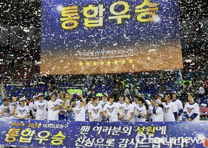 (부천=포커스뉴스) 20일 부천체육관에서 열린 2015-2016 여자프로농구 챔피언결정전 3차전에서 KEB하나은행을 물리치고 3승으로 통합 우승을 차지한 우리은행 선수들이 트로피를 들고 기념사진을 찍고 있다.